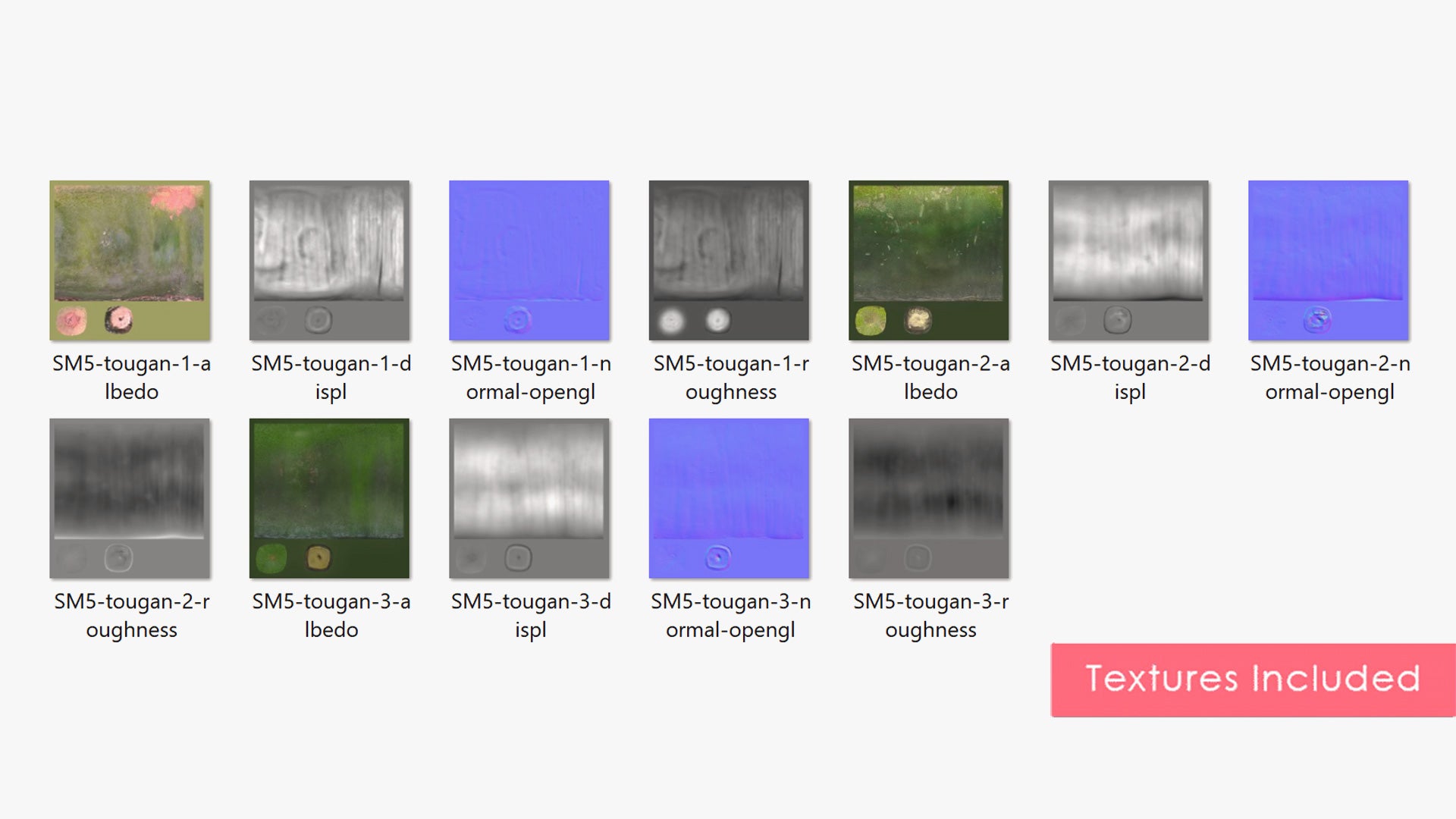 The product contains Albedo, Roughness, Displacement, and Normal map (OpenGL) textures.