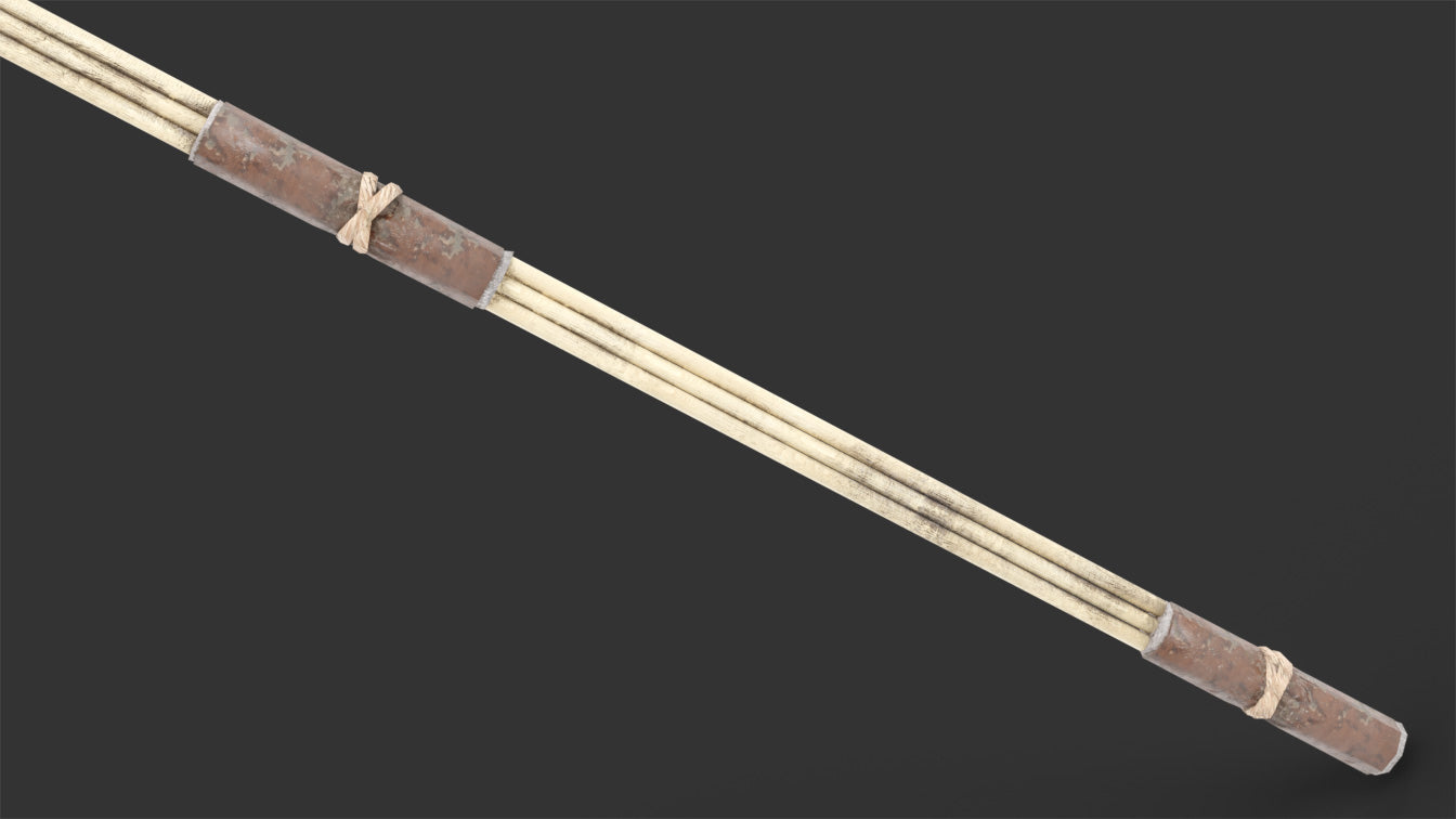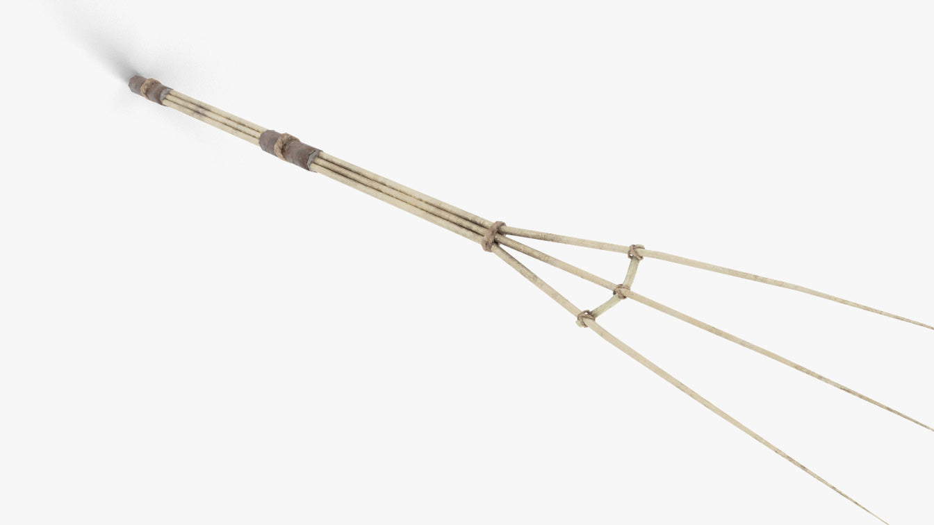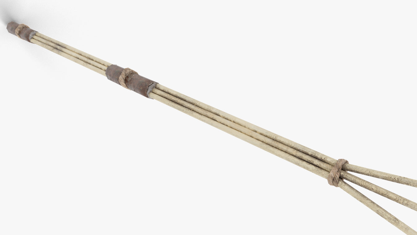 This is a digital 3D model of a medieval style wooden hay fork. The fork has a slim design, with three pointy ends that look very sharp. It is made of wood, and it is tied with handmade rope. The fork has some areas of leather padding in the places where the character holds the body while at work, for added realism and comfort.